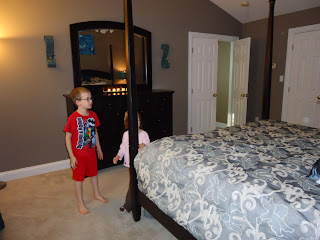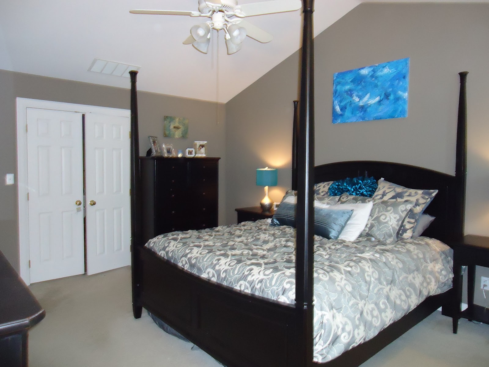 The walls of the bedroom were gray and the adjoining bath was red when we got here. We had the bathroom repainted blue a few months ago. I love the way it looks with the white tiles and silver fixtures! I wanted to do our bedroom with blue and silvers – not matchy-matchy with the bathroom, but something that would flow well between the two spaces.